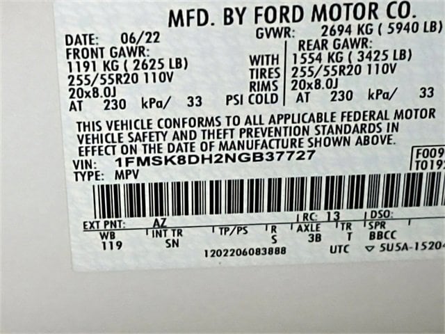 Recent Arrival! Equipment Group 202A (1st Row Heated Seats, Acoustic-Laminated Front Side Windows, ActiveX Captain's Chairs, Heated Steering Wheel, LED Fog Lamps, Remote Start System, and SecuriCode Keyless Entry Keypad), Ford Co-Pilot360 Assist+ (Evasive Steering Assist, Intelligent Adaptive Cruise Control, Speed Sign Recognition, and Voice-Activated Touchscreen Navigation System), 20" Premium Painted Aluminum Wheels, 3.58 Non-Limited-Slip Rear Axle Ratio, 3rd row seats: bench, 4-Wheel Disc Brakes, 6 Speakers, ABS brakes, Air Conditioning, Alloy wheels, AM/FM radio: SiriusXM, AM/FM Stereo, Auto High-beam Headlights, Auto Start-Stop Removal, Automatic temperature control, Brake assist, Bumpers: body-color, Cargo Area Management System, Compass, Delay-off headlights, Driver door bin, Driver vanity mirror, Dual front impact airbags, Dual front side impact airbags, Electronic Stability Control, Emergency communication system: SYNC 3 911 Assist, Exterior Parking Camera Rear, FordPass Connect, Four wheel independent suspension, Front & Second Row Floor Liners (16A), Front anti-roll bar, Front Bucket Seats, Front Center Armrest, Front dual zone A/C, Front reading lights, Fully automatic headlights, Heated door mirrors, Heated front seats, Illuminated entry, Knee airbag, Leather steering wheel, Low tire pressure warning, Occupant sensing airbag, Outside temperature display, Overhead airbag, Overhead console, Panic alarm, Passenger door bin, Passenger vanity mirror, Power door mirrors, Power driver seat, Power Liftgate, Power passenger seat, Power steering, Power windows, Rear air conditioning, Rear anti-roll bar, Rear Auxiliary Controls Credit, Rear reading lights, Rear window defroster, Rear window wiper, Remote keyless entry, Roof rack: rails only, Security system, Speed control, Speed-sensing steering, Speed-Sensitive Wipers, Split folding rear seat, Spoiler, Steering wheel mounted audio controls, SYNC 3 Communications & Entertainment System, SYNC 3/Apple CarPlay/Android Auto, Tachometer, Telescoping steering wheel, Tilt steering wheel, Traction control, Trip computer, Twin Panel Moonroof, Unique Cloth Captain's Chairs, Variably intermittent wipers, and Wheels: 18" 5-Spoke Silver-Painted Aluminum.