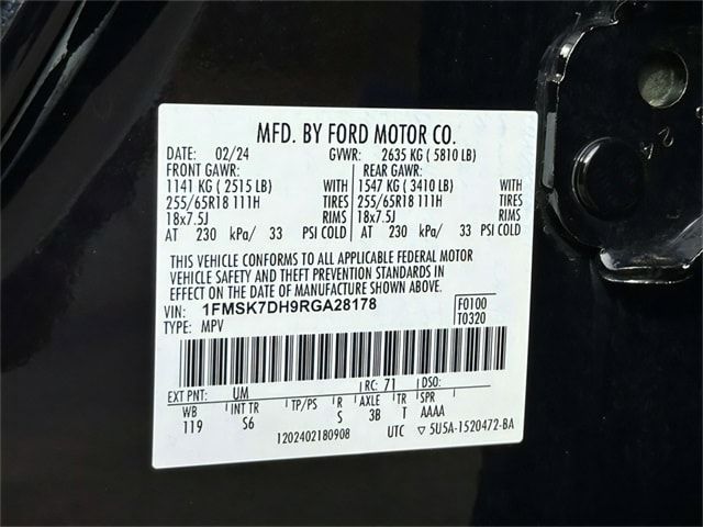 Equipment Group 202A (Heated ActiveX Captain's Chairs, Heated Steering Wheel, LED Fog Lamps, Remote Start System, and SecuriCode Keyless Entry Keypad), Wheels: 18" 5-Spoke Silver-Painted Aluminum, 2nd Row 35/30/35 Bench w/E-Z Entry & Armrest, 3.58 Non-Limited-Slip Rear Axle Ratio, 3rd row seats: bench, 4-Wheel Disc Brakes, 4G LTE Wi-Fi Hotspot Credit, 6 Speakers, ABS brakes, Air Conditioning, Alloy wheels, AM/FM radio: SiriusXM, AM/FM Stereo, Auto High-beam Headlights, Automatic temperature control, Brake assist, Bumpers: body-color, Compass, Delay-off headlights, Driver door bin, Driver vanity mirror, Dual front impact airbags, Dual front side impact airbags, Electronic Stability Control, Emergency communication system: SYNC 3 911 Assist, Exterior Parking Camera Rear, FordPass Connect, Four wheel independent suspension, Front anti-roll bar, Front Bucket Seats, Front Center Armrest, Front dual zone A/C, Front reading lights, Fully automatic headlights, Heated door mirrors, Heated front seats, Heated Unique Cloth Captain's Chairs, Illuminated entry, Knee airbag, Leather steering wheel, Low tire pressure warning, Occupant sensing airbag, Outside temperature display, Overhead airbag, Overhead console, Panic alarm, Passenger door bin, Passenger vanity mirror, Power door mirrors, Power driver seat, Power Liftgate, Power passenger seat, Power steering, Power windows, Rear air conditioning, Rear anti-roll bar, Rear Auxiliary Controls Credit, Rear reading lights, Rear window defroster, Rear window wiper, Remote keyless entry, Security system, Speed control, Speed-sensing steering, Speed-Sensitive Wipers, Split folding rear seat, Spoiler, Steering wheel mounted audio controls, SYNC 3 Communications & Entertainment System, SYNC 3/Apple CarPlay/Android Auto, Tachometer, Telescoping steering wheel, Tilt steering wheel, Traction control, Trip computer, and Variably intermittent wipers.