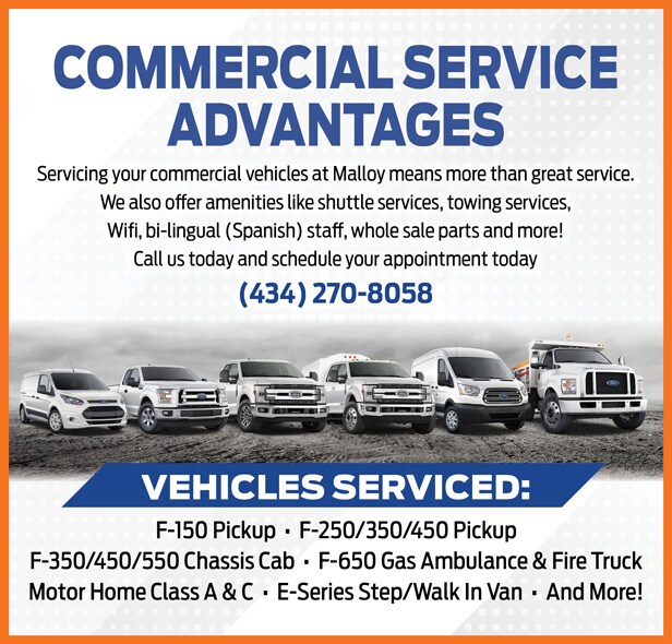 Do you want a reliable truck to take you business to an all-new level? Visit Malloy Ford of Charlottesville! We are glad to be your premier local Ford Commercial Vehicle Center and have an inventory of outstanding commercial vehicles that will assist you in getting your projects done the right way. We are here to learn about what your business requires, walk around the commercial trucks we have in stock, and let you try out whichever models catch your eye the most. We will also give you the facts that you need on every commercial truck that is in our inventory. You can rely on our experienced financing team to go over your budget with you and see which Ford commercial truck that is in our inventory. You can rely on our experienced financing team to go over your budget with you and see which Ford commercial truck accommodates it the best. We believe that your business should have the right tools in order to grow and that is why it is always a great idea to Make It Malloy!