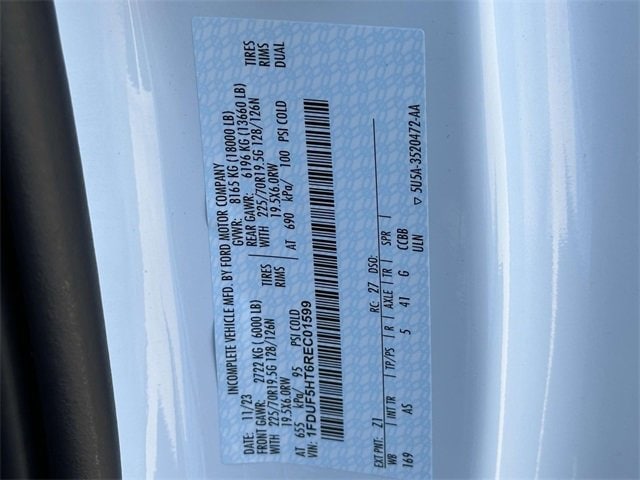 GVWR: 18,000 lbs Payload Package, ABS brakes, Compass, Heated door mirrors, Illuminated entry, Remote keyless entry, Traction control, 4 Speakers, 4-Wheel Disc Brakes, 4.88 Axle Ratio, Air Conditioning, AM/FM radio, AM/FM Stereo w/MP3 Player, Brake assist, Delay-off headlights, Dual front impact airbags, Dual front side impact airbags, Dual rear wheels, Emergency communication system: SYNC 4 911 Assist, Front anti-roll bar, Front Center Armrest w/Storage, Front reading lights, Fully automatic headlights, Outside temperature display, Overhead airbag, Overhead console, Panic alarm, Passenger cancellable airbag, Passenger vanity mirror, Power door mirrors, Power steering, Power windows, Rear anti-roll bar, Speed control, Steering wheel mounted audio controls, SYNC 4 Communications & Entertainment System, Tachometer, Telescoping steering wheel, Tilt steering wheel, Trip computer, Turn signal indicator mirrors, Variably intermittent wipers, and Wheels: 19.5" x 6" Argent Painted Steel. 2024 ABS brakes, Compass, Heated door mirrors, Illuminated entry, Remote keyless entry, Traction control. Ford F-550SD DRW Power Stroke 6.7L V8 DI 32V OHV Turbodiesel Oxford White