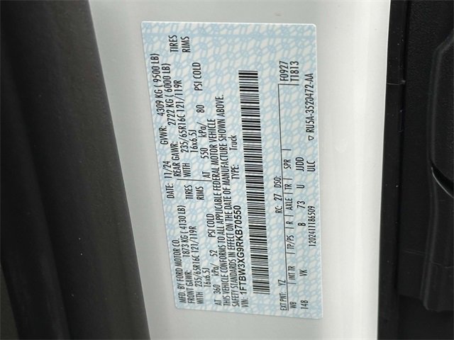 Heavy-Duty Trailer Tow Package (Frame Mounted Hitch Receiver and Tow/Haul Mode w/Trailering Wiring Provisions), Load Area Protection Package (Front & Rear Vinyl Floor Covering), Order Code 101A, 2 Additional Keys (4 Total), 4 Speakers, 4-Wheel Disc Brakes, ABS brakes, Air Conditioning, AM/FM radio, AM/FM Stereo, Auto High-beam Headlights, Brake assist, Dark Palazzo Gray Vinyl Bucket Seats, Delay-off headlights, Digital Rearview Mirror, Driver door bin, Driver's Seat Mounted Armrest, Dual front impact airbags, Dual front side impact airbags, Electronic Air Temperature Control, Electronic Stability Control, Exterior Parking Camera Rear, Front anti-roll bar, Front Bucket Seats, Front License Plate Bracket, Front reading lights, Front wheel independent suspension, Fully automatic headlights, High Resolution Digital Camera, Illuminated entry, Low tire pressure warning, Occupant sensing airbag, Overhead airbag, Panic alarm, Passenger cancellable airbag, Passenger door bin, Power door mirrors, Power steering, Power windows, Radio: AM/FM Stereo w/SYNC 4, Remote keyless entry, Reverse Sensing System, Short-Arm Manual-Folding Power Adjust Mirrors, Speed control, Steering wheel mounted audio controls, Tachometer, Telescoping steering wheel, Tilt steering wheel, Traction control, Variably intermittent wipers, Vinyl Front Bucket Seats, and Wheels: 16" Silver Steel w/Black Hubcap. 2024 Ford Transit-350 EcoBoost 3.5L V6 GTDi DOHC 24V Twin Turbocharged Oxford White