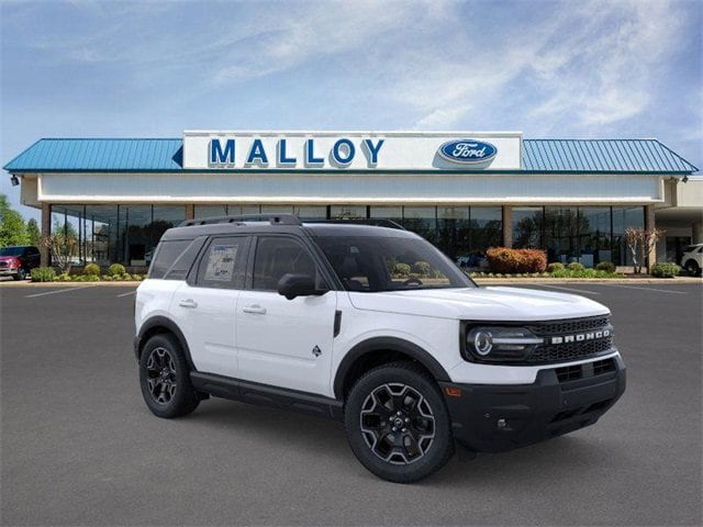 Equipment Group 300A, Outer Banks Tech Package+ (B&O Sound System by Bang & Olufsen, Connected Navigation, and HD Radio), 360-Degree Camera w/Trail & Split View, 4-Wheel Disc Brakes, 6 Speakers, ABS brakes, Air Conditioning, Alloy wheels, AM/FM radio: SiriusXM, AM/FM Stereo, Auto High-beam Headlights, Auto-dimming Rear-View mirror, Automatic temperature control, Brake assist, Compass, Delay-off headlights, Driver door bin, Driver vanity mirror, Dual front impact airbags, Dual front side impact airbags, Electronic Stability Control, Emergency communication system: SYNC 4 911 Assist, Four wheel independent suspension, Front anti-roll bar, Front Bucket Seats, Front Center Armrest, Front Driver/Passenger Seat Back Map Pockets, Front dual zone A/C, Front fog lights, Front License Plate Bracket, Front Parking Sensors, Front reading lights, Fully automatic headlights, Garage door transmitter, Heated door mirrors, Heated front seats, Heated steering wheel, Illuminated entry, Knee airbag, Low tire pressure warning, Memory seat, Occupant sensing airbag, Outside temperature display, Overhead airbag, Overhead console, Panic alarm, Passenger door bin, Passenger vanity mirror, Power door mirrors, Power driver seat, Power Moonroof, Power passenger seat, Power steering, Power windows, Premium Trimmed Front Bucket Seats w/Ebony/Roast, Radio data system, Rain sensing wipers, Rear anti-roll bar, Rear Parking Sensors, Rear reading lights, Rear seat center armrest, Rear window defroster, Rear window wiper, Remote keyless entry, Reverse Brake Assist, Security system, SiriusXM, Speed control, Speed-sensing steering, Speed-Sensitive Wipers, Split folding rear seat, Steering wheel mounted audio controls, SYNC 4 w/Enhanced Voice Recognition, Tachometer, Telescoping steering wheel, Tilt steering wheel, Traction control, Trip computer, Variably intermittent wipers, and Wheels: 18" Ebony Black-Painted Aluminum. 2025 Ford Bronco Sport 1.5L EcoBoost Oxford White