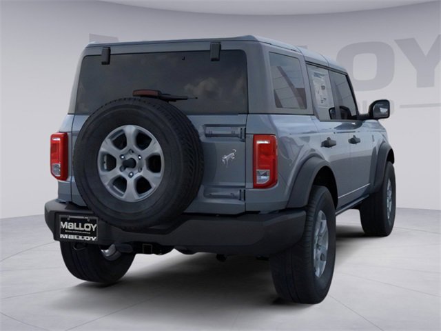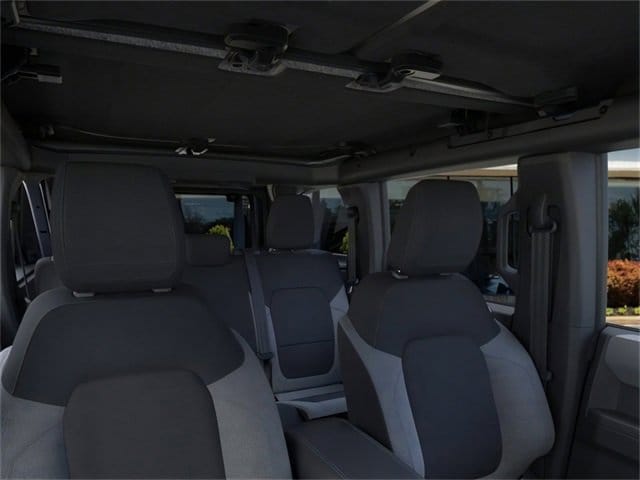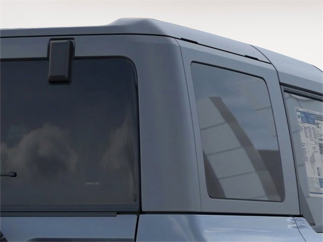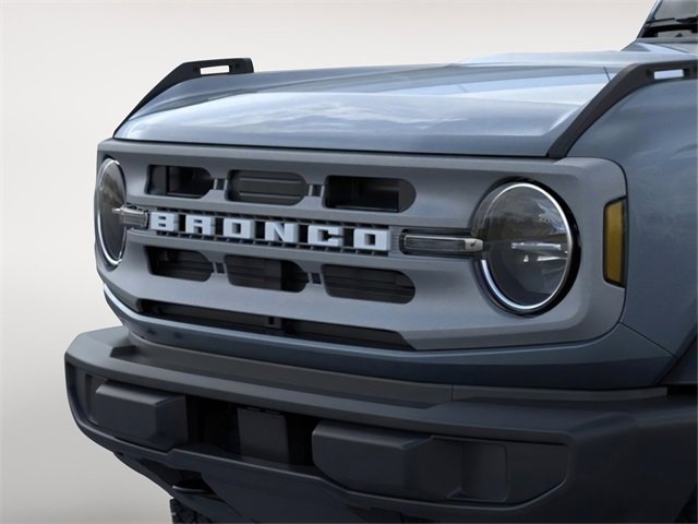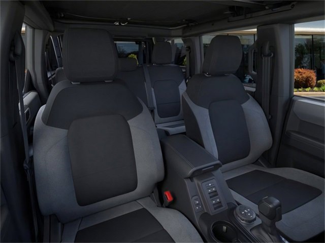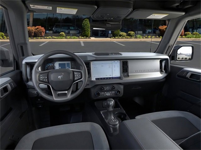 4-Wheel Disc Brakes, 4.46 Axle Ratio, 7 Speakers, ABS brakes, Air Conditioning, Alloy wheels, AM/FM radio: SiriusXM with 360L, AM/FM Stereo, Auto High-beam Headlights, Brake assist, Cloth Bucket Seats, Compass, Delay-off headlights, Driver door bin, Driver vanity mirror, Dual front impact airbags, Dual front side impact airbags, Electronic Stability Control, Emergency communication system: 911 Assist, Exterior Parking Camera Rear, Front anti-roll bar, Front Bucket Seats, Front Center Armrest, Front reading lights, Front wheel independent suspension, Fully automatic headlights, Heated door mirrors, Illuminated entry, Integrated roll-over protection, Internet access capable: FordPass Connect, Leather Shift Knob, Low tire pressure warning, Occupant sensing airbag, Outside temperature display, Overhead airbag, Overhead console, Panic alarm, Passenger door bin, Passenger vanity mirror, Power door mirrors, Power steering, Power windows, Radio data system, Remote keyless entry, Security system, SiriusXM w/360L, Speed control, Split folding rear seat, Steering wheel mounted audio controls, SYNC 4, Tachometer, Telescoping steering wheel, Tilt steering wheel, Traction control, Trip computer, Variably intermittent wipers, and Wheels: 17" Carbonized Gray-Painted Aluminum. 2025 Ford Bronco 2.3L EcoBoost I-4 Azure Gray Metallic Tri-Coat