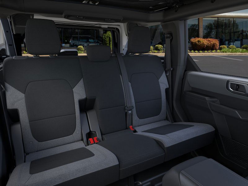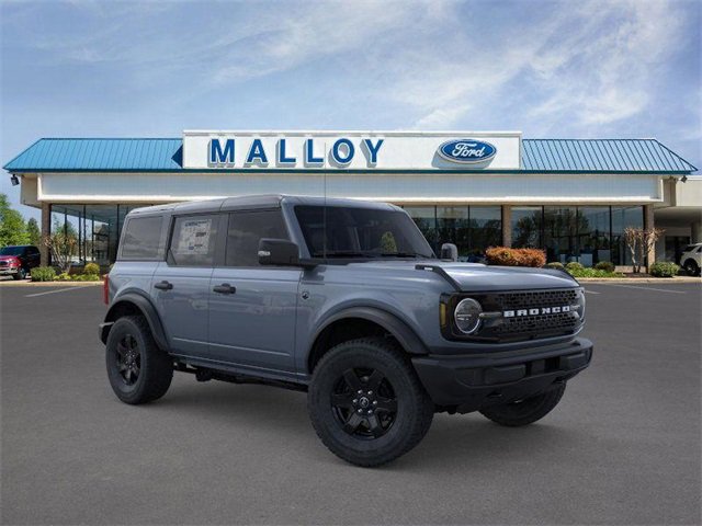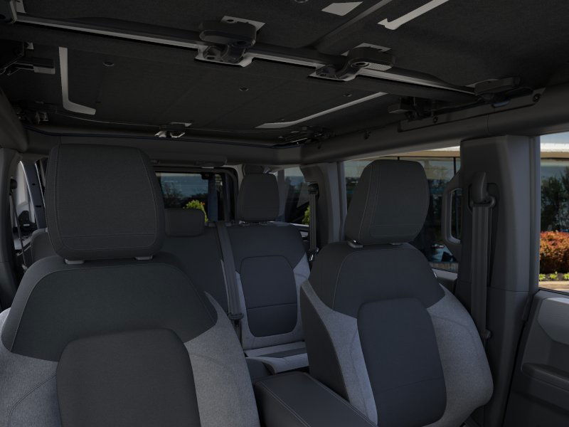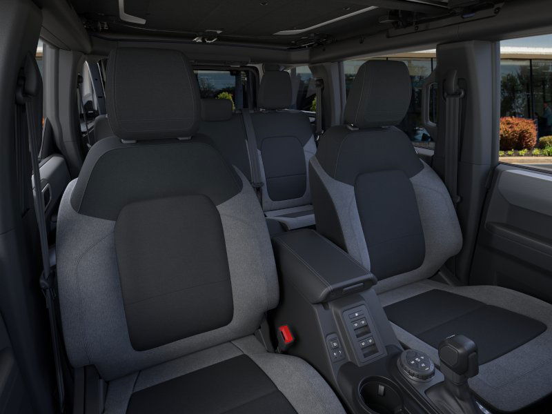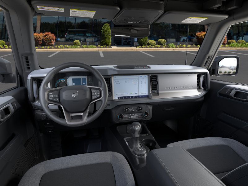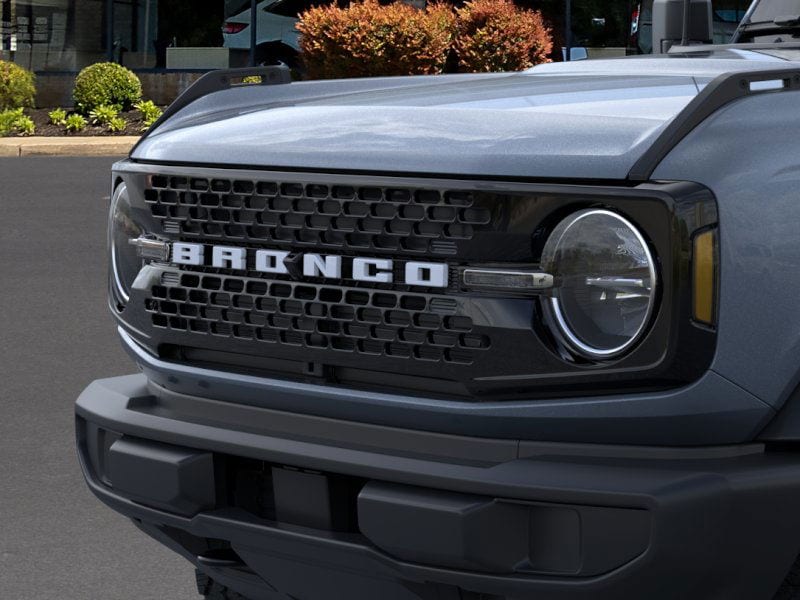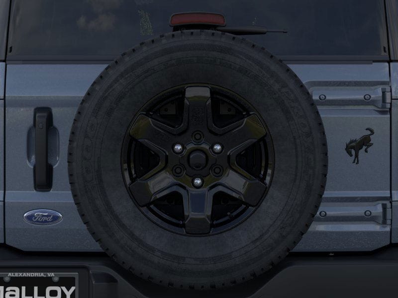 Black Appearance Package (Black Molded-In-Color Door Handles, Black Molded-In-Color Fender Flares, Black Molded-In-Color Sideview Mirror Caps, and Black-Painted Molded-In-Color Grille), Equipment Group 222A Mid Package (2-Door Intelligent Access w/Lock/Unlock, Ambient Footwell Lighting, Connected Navigation, Dr & Pass Illuminated Sliding Visor Vanity Mirrors, Dual Smart Charging USB Ports, Dual-Zone Electronic Automatic Temperature Control, Front Row Heated Seats, Power Outlet - Back Side of Center Floor Console, and Rear Parking Sensors), 4-Wheel Disc Brakes, 4.46 Axle Ratio, 7 Speakers, ABS brakes, Air Conditioning, Alloy wheels, AM/FM radio: SiriusXM with 360L, AM/FM Stereo, Auto High-Beam Headlamps, Auto High-beam Headlights, BLIS Blind Spot Information System, Brake assist, Cloth Bucket Seats, Compass, Delay-off headlights, Driver door bin, Driver vanity mirror, Dual front impact airbags, Dual front side impact airbags, Electronic Stability Control, Emergency communication system: 911 Assist, Exterior Parking Camera Rear, Front anti-roll bar, Front Bucket Seats, Front Center Armrest, Front License Plate Bracket, Front reading lights, Front wheel independent suspension, Fully automatic headlights, Hard Top Sound Deadening Headliner, Heated door mirrors, Illuminated entry, Integrated roll-over protection, Lane-Keeping System, Leather Shift Knob, Low tire pressure warning, Occupant sensing airbag, Outside temperature display, Overhead airbag, Overhead console, Panic alarm, Passenger door bin, Passenger vanity mirror, Power door mirrors, Power steering, Power windows, Pre-Collision Assist w/Automatic Emergency Braking, Radio data system, Rear-View Camera, Rear-Window Defroster & Washer, Remote keyless entry, Remote Start System, Security system, Shadow Black Painted Hard Top, SiriusXM w/360L, Speed control, Split folding rear seat, Steering wheel mounted audio controls, SYNC 4, Tachometer, Telescoping steering wheel, Tilt steering wheel, Traction control, Trip computer, Variably intermittent wipers, Wheels: 17" Black High Gloss Painted Aluminum, and Wheels: 17" Carbonized Gray-Painted Aluminum. 2025 Ford Bronco 2.3L EcoBoost I-4 Azure Gray Metallic Tri-Coat