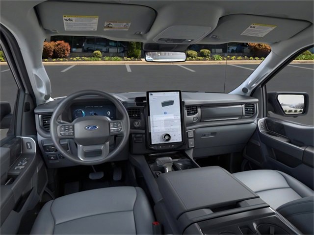 Equipment Group 312A Standard, 4-Wheel Disc Brakes, 8 Speakers, ABS brakes, ActiveX Trimmed Heated Front Seats, Adjustable pedals, Air Conditioning, Alloy wheels, Auto High-beam Headlights, Auto-dimming Rear-View mirror, Automatic temperature control, Brake assist, Bumpers: body-color, Compass, Delay-off headlights, Driver door bin, Driver vanity mirror, Dual front impact airbags, Dual front side impact airbags, Electronic Stability Control, Emergency communication system: SYNC 4 911 Assist, Four wheel independent suspension, Front anti-roll bar, Front Bucket Seats, Front Center Armrest, Front dual zone A/C, Front License Plate Bracket, Front reading lights, Fully automatic headlights, Heated door mirrors, Heated front seats, Heated steering wheel, Illuminated entry, Knee airbag, Low tire pressure warning, Mobile Power Cord (120/240V), Navigation system: Connected Navigation, Occupant sensing airbag, Outside temperature display, Overhead airbag, Overhead console, Panic alarm, Passenger door bin, Passenger vanity mirror, Power door mirrors, Power driver seat, Power passenger seat, Power steering, Power windows, Radio data system, Radio: B&O Sound System by Bang & Olufsen, Rear anti-roll bar, Rear reading lights, Rear step bumper, Rear window defroster, Remote keyless entry, Security system, Speed control, Speed-sensing steering, Split folding rear seat, Steering wheel mounted audio controls, SYNC 4A w/Enhanced Voice Recognition, Telescoping steering wheel, Tilt steering wheel, Traction control, Trip computer, Turn signal indicator mirrors, Variably intermittent wipers, and Wheels: 20" Alloy Dark Carbonized Gray. 2025 Ford F-150 Lightning Electric Motor Oxford White