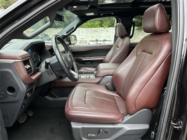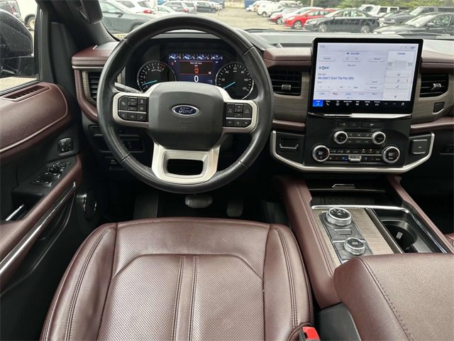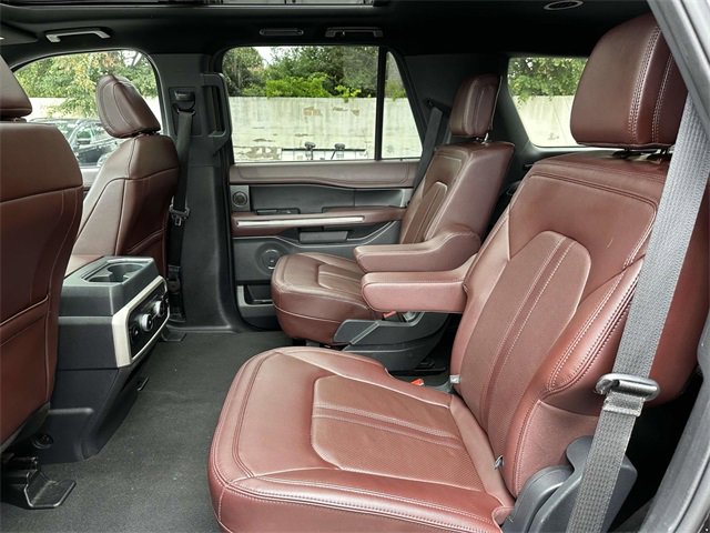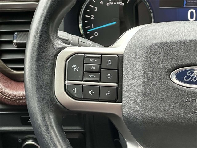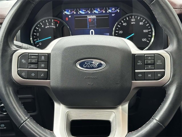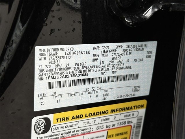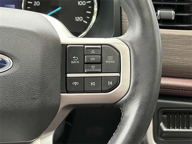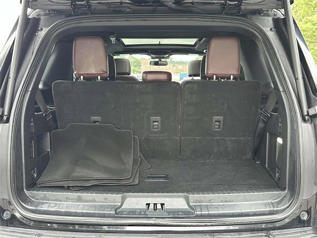 Equipment Group 301A Mid Package (Panoramic Vista Roof), Adjustable pedals, Heated & Ventilated Leather Front Captain's Chairs, Heated steering wheel, Leather steering wheel, Memory seat, Navigation system: Connected Navigation, Pedal memory, Power driver seat, Power moonroof, Power steering, Power windows, Remote keyless entry, Steering wheel memory, Steering wheel mounted audio controls, 12 Speakers, 3.31 Axle Ratio, 3rd row seats: split-bench, 4-Wheel Disc Brakes, ABS brakes, Air Conditioning, Alloy wheels, AM/FM radio: SiriusXM with 360L, Auto High-beam Headlights, Auto-dimming door mirrors, Auto-dimming Rear-View mirror, Automatic temperature control, Brake assist, Bumpers: body-color, Compass, Delay-off headlights, Driver door bin, Driver vanity mirror, Dual front impact airbags, Dual front side impact airbags, Electronic Stability Control, Emergency communication system: SYNC 4 911 Assist, Exterior Parking Camera Rear, Four wheel independent suspension, Front anti-roll bar, Front Bucket Seats, Front Center Armrest, Front dual zone A/C, Front fog lights, Front reading lights, Fully automatic headlights, Garage door transmitter, Heated door mirrors, Heated front seats, Heated rear seats, Heated/Ventilated Lthr Front Captain's Chairs (A), Illuminated entry, Low tire pressure warning, Occupant sensing airbag, Outside temperature display, Overhead airbag, Overhead console, Panic alarm, Passenger door bin, Passenger vanity mirror, Power door mirrors, Power Liftgate, Power passenger seat, Radio data system, Radio: B&O Sound System by Bang & Olufsen, Rain sensing wipers, Rear air conditioning, Rear anti-roll bar, Rear reading lights, Rear window defroster, Rear window wiper, Reclining 3rd row seat, Security system, SiriusXM w/360L, Speed control, Speed-sensing steering, Speed-Sensitive Wipers, Split folding rear seat, Spoiler, SYNC 4 w/Enhanced Voice Recognition, Tachometer, Telescoping steering wheel, Tilt steering wheel, Traction control, Trip computer, Turn signal indicator mirrors, Variably intermittent wipers, Ventilated front seats, Voltmeter, and Wheels: 20" Bright Machined Aluminum.